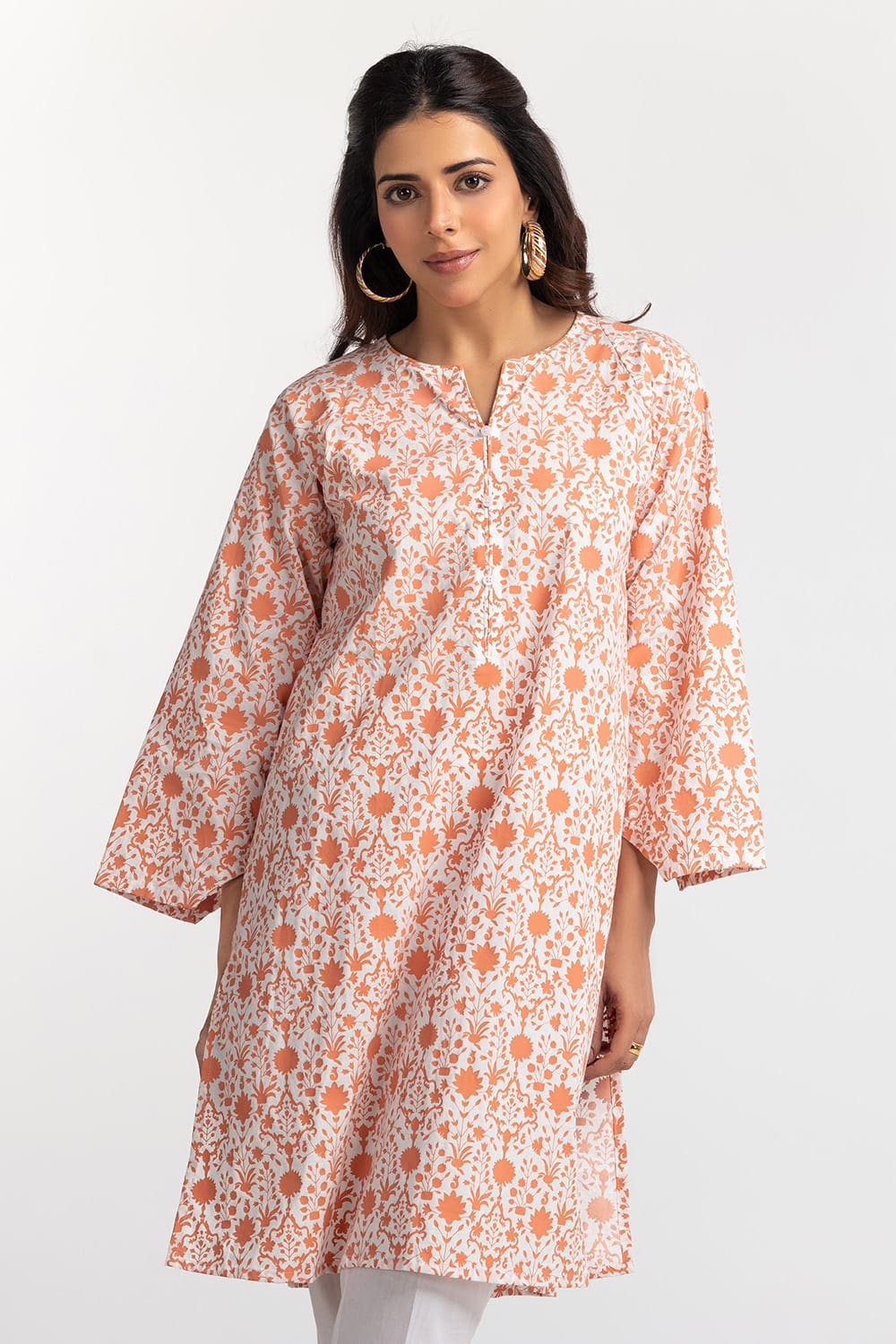 Ready to wear Brighten your wardrobe with this vibrant peach and white patterned kurta. It features a round neckline, straight sleeves, and a straight hem. Great for adding a pop of color