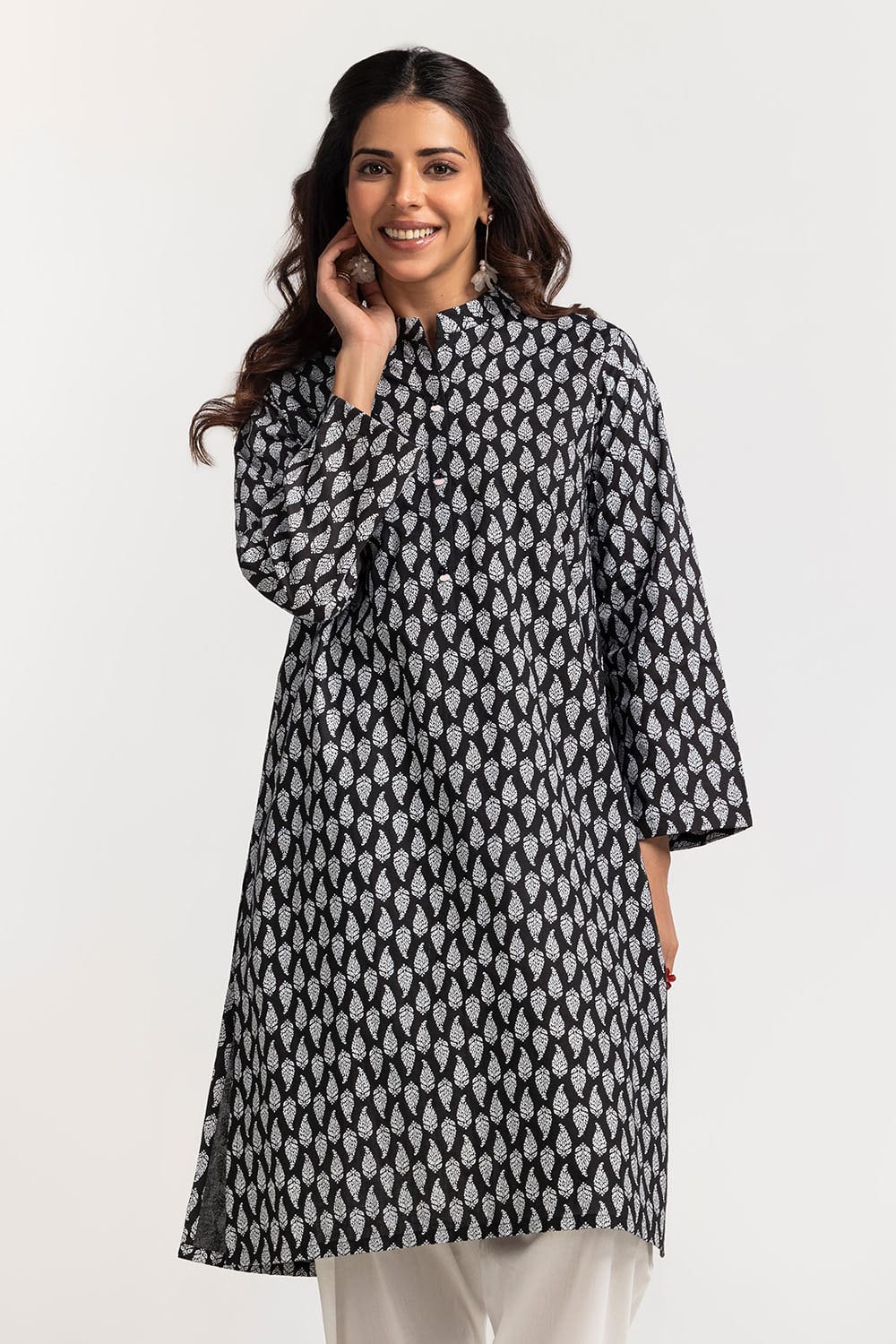 Ready to wear Timeless elegance defines this black and white patterned kurta. It features a round neckline, full sleeves, and a straight hem. Perfect for a classic and elegant look