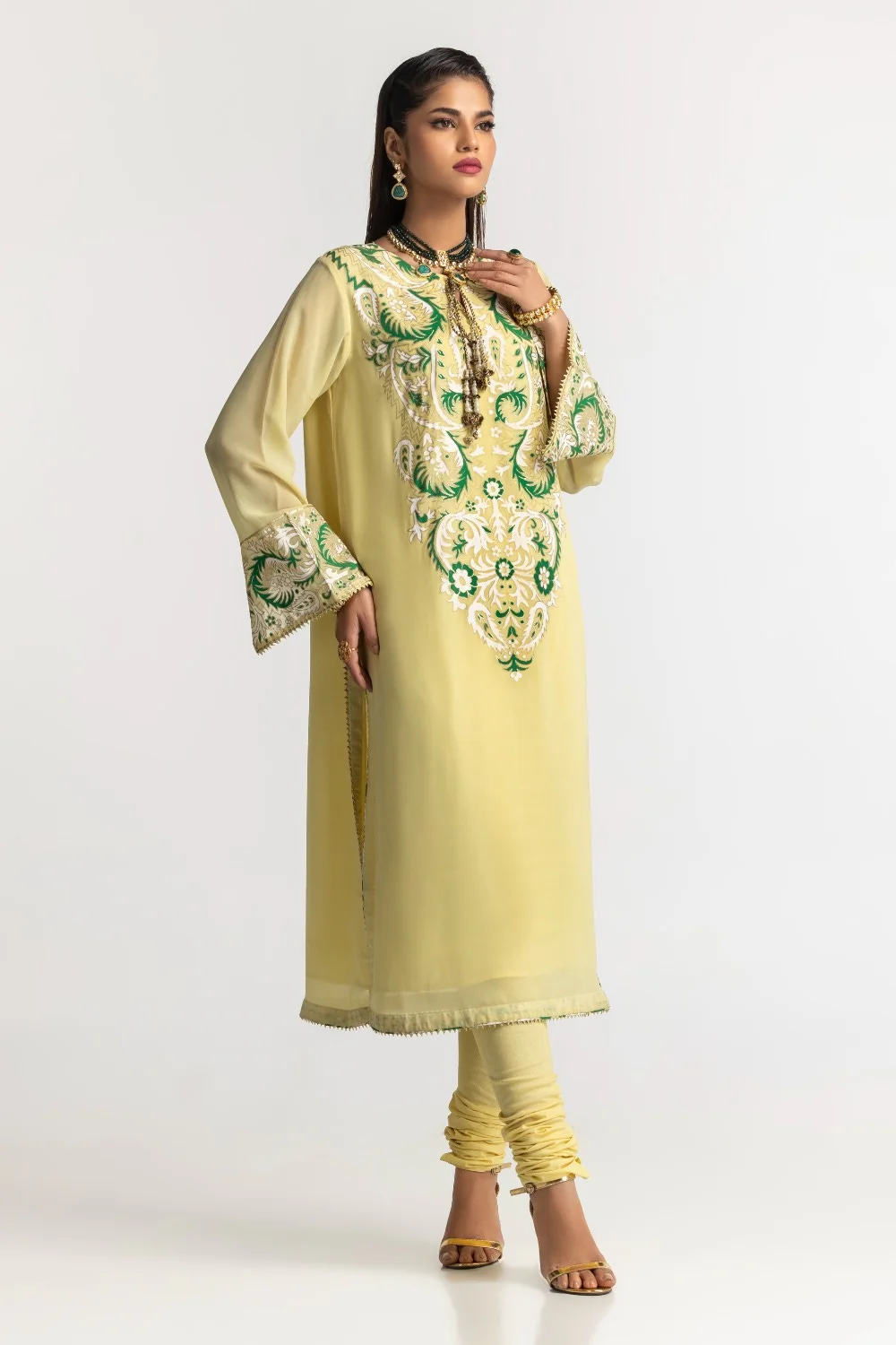 Ready to wear Style yourself in best fashion with this yellow-dyed georgette shirt, featuring a round neck with dori and beautiful floral foil print on the front, back, and sleeves.