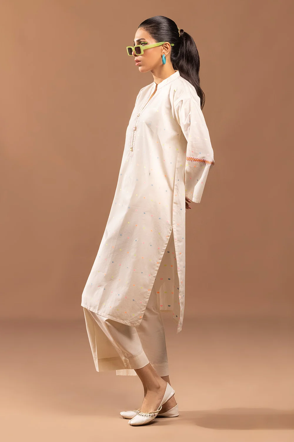 Ready to wear Elevate your style with this sophisticated beige kurta. Featuring delicate multicolored design, embellished placket and a mandarin collar, this long-sleeve kurta is perfect for any occasion.
