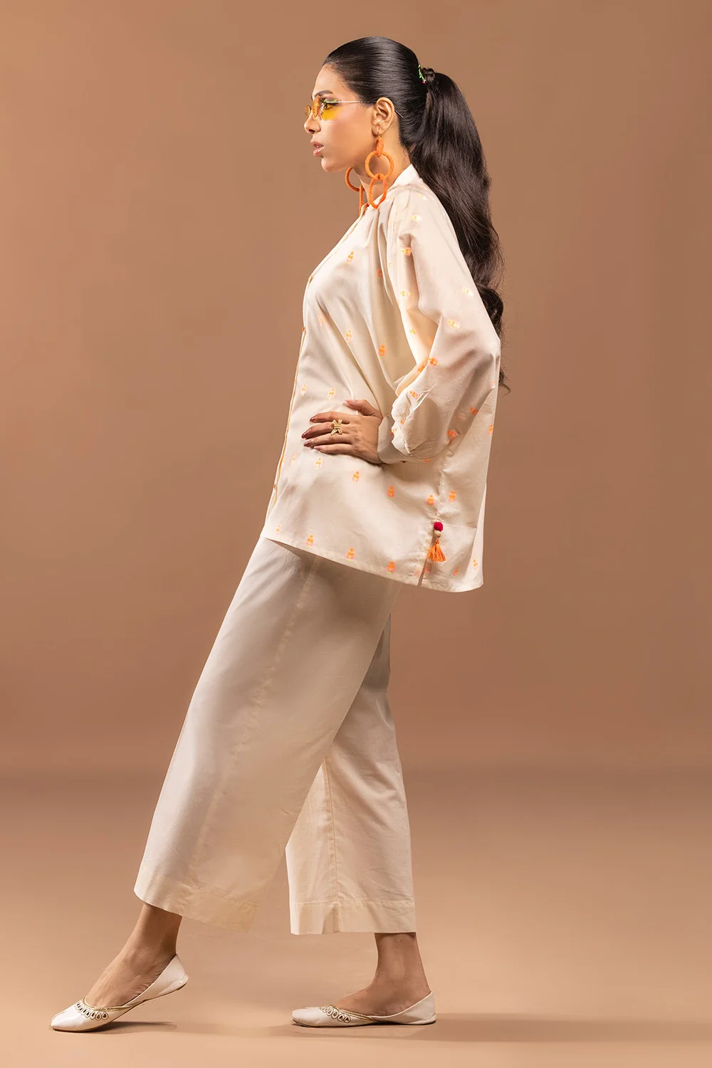 Ready to wear Elevate your casual wardrobe with this elegant beige button-down tunic. Featuring delicate orange floral design and embellishments, this long-sleeve shirt offers a relaxed fit and versatile style.