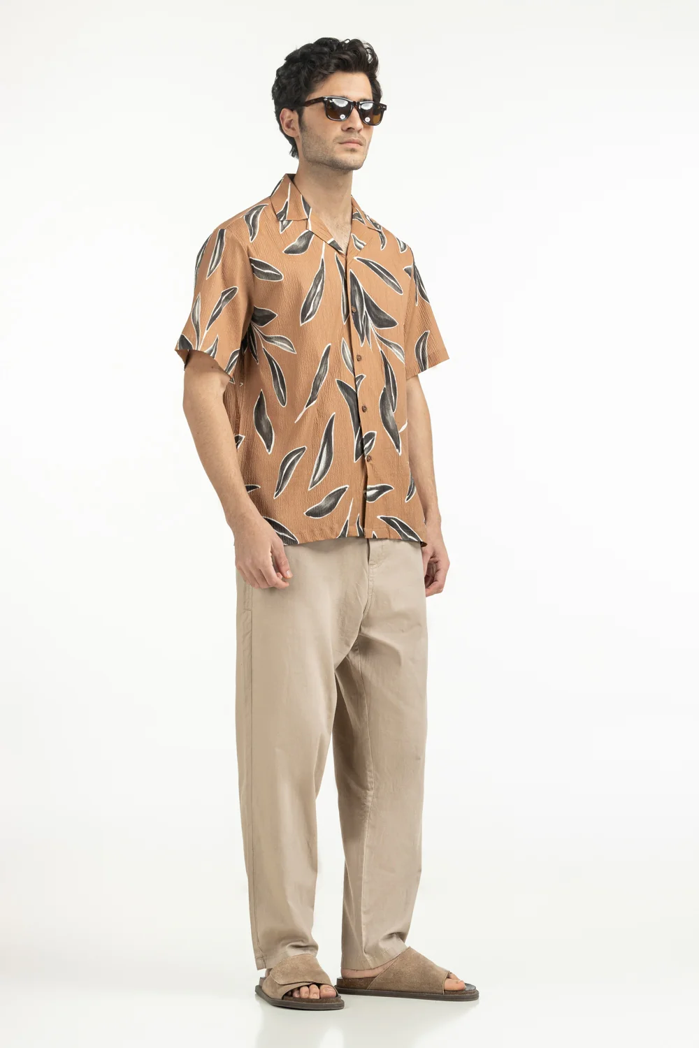 Infused with earthy charm, this shirt creates a modern canvas for everyday style. The crinkled texture offers an edgy layer of sophistication, while the notch collar adds refinement. Designed with short sleeves for maximum comfort during harsh summer.