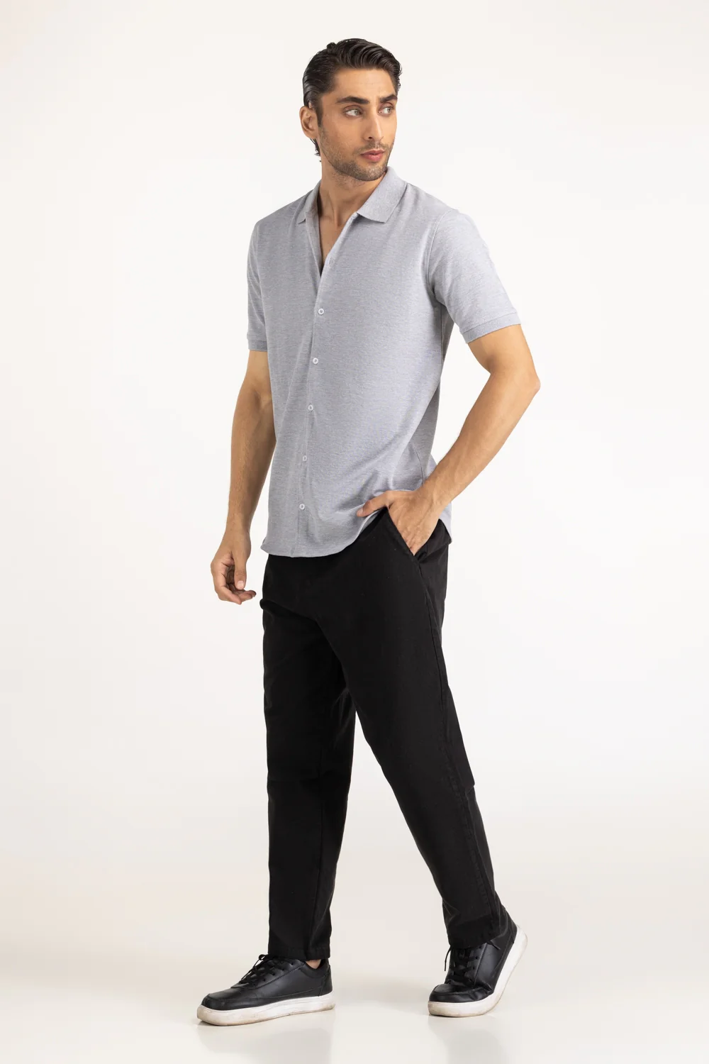 This polo features a front-open button-down style that blends function with a contemporary aesthetic. Its soft grey hue and breathable cotton pique fabric makes it a strong choice for sunny weather